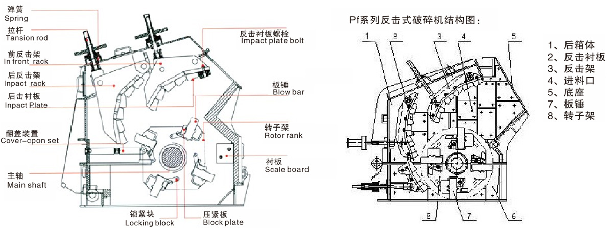反擊板與板錘間隙能方便調(diào)節(jié),有效控制出料粒度,顆粒形狀好;